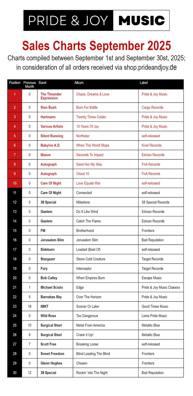 Sales Charts Pride & Joy Music